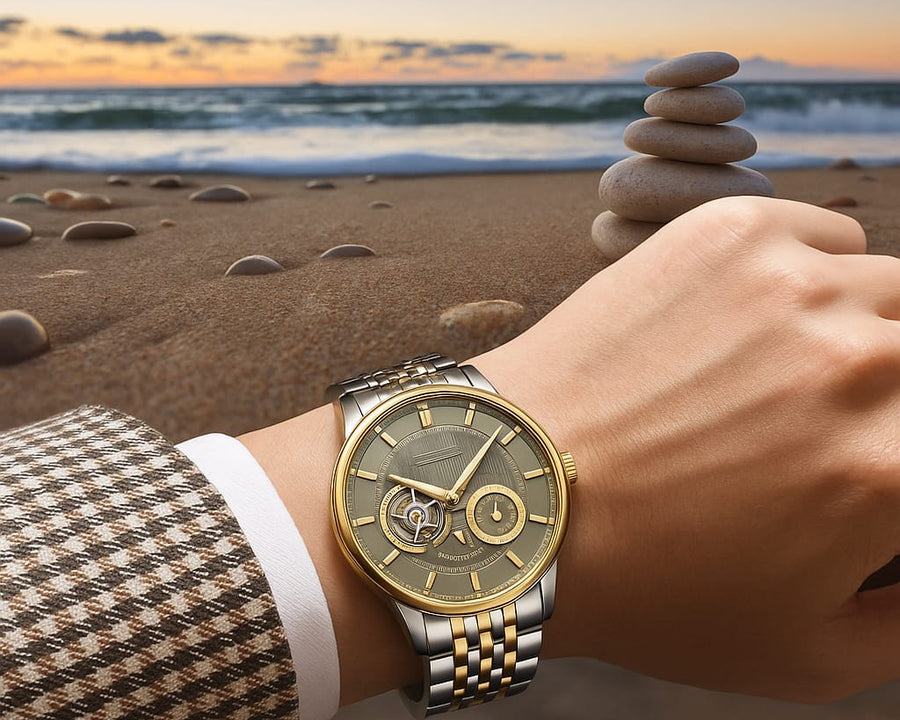 From Riyadh’s golden dunes to California’s glowing horizons, this masterpiece mirrors the timeless beauty of the sun setting over the sands. A watch built for men who carry the essence of power and grace.