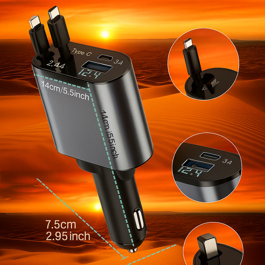 Charge iPhone, Samsung, Huawei & AirPods all at once with this Smart Retractable Car Charger.