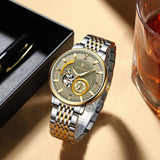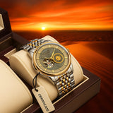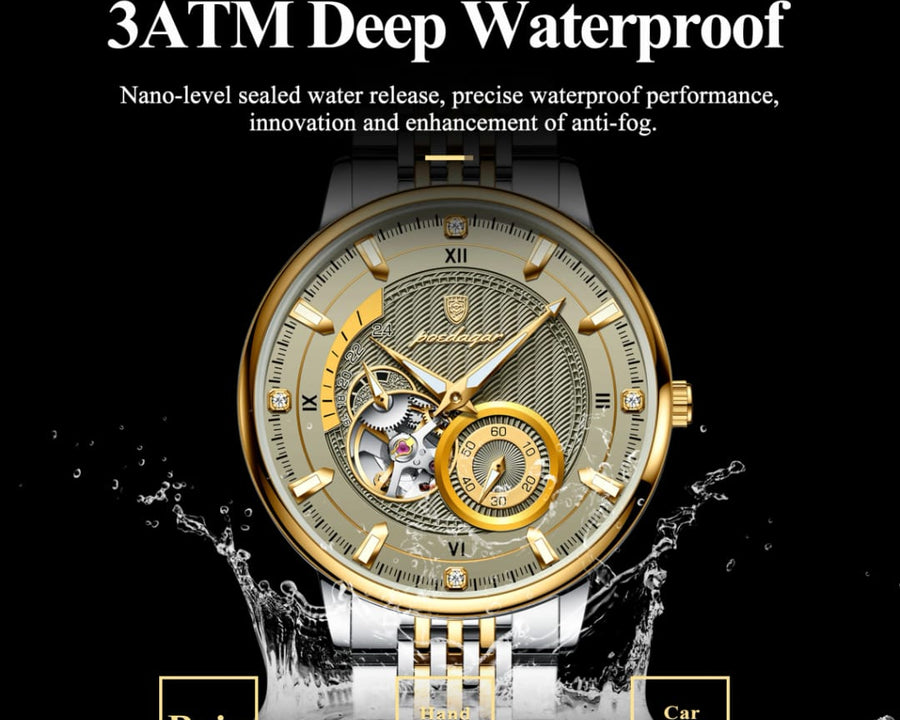 "The POEDAGAR 1416 Tourbillon Automatic Watch – where luxury meets performance. Featuring a bold gold-accented design, automatic self-wind movement, luminous dial, and 3ATM waterproof durability. Perfect for Saudi evenings in the desert or American nights in the city—style and strength for every moment."