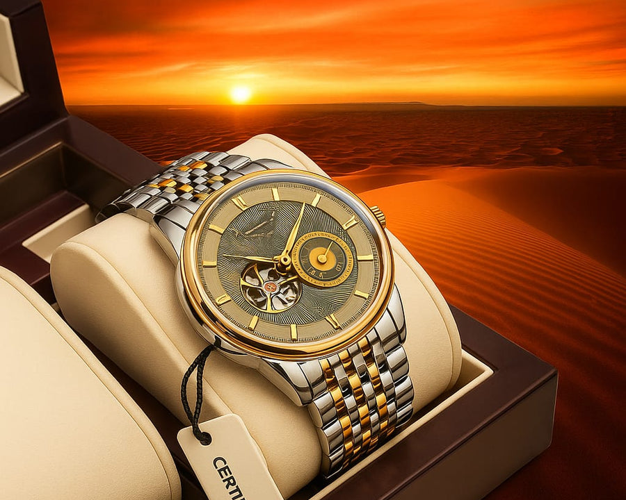 From Riyadh’s golden dunes to California’s glowing horizons, this masterpiece mirrors the timeless beauty of the sun setting over the sands. A watch built for men who carry the essence of power and grace.