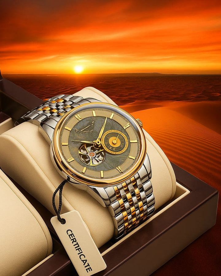 Made from high-grade stainless steel with gold accents, this automatic watch requires no battery – it runs on motion, embodying strength, energy, and continuity. Whether in a boardroom, at a wedding, or during an evening gathering, this watch stands as the ultimate mark of success and refined taste.